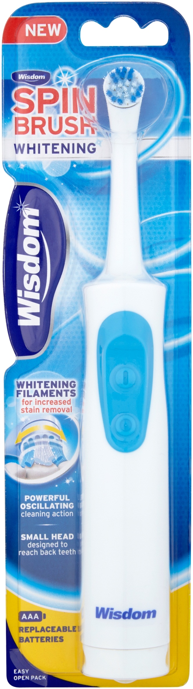 NOUVEAU La brosse à batterie Spinbrush de Wisdom a été spécialement conçu pour assurer un nettoyage puissant et l'élimination des taches. Les filaments de blanchiment permettent d'éliminer les taches de surface pour les dents plus blanches, tandis que la puissante action de nettoyage oscillante permet un retrait efficace de la plaque. Utilisez deux fois par jour pendant 2 minutes pour les dents plus blanches et un sourire sain! Piles remplaçables: Pour remplacer, dévisser la vis de fixation à l'arrière de la brosse pour libérer le capuchon de base. Remplacez avec 2 nouvelles piles AAA dans le positionnement conseillé. Rebranchez le capuchon de base, insérez et serrez la vis jusqu'à ce qu'elle soit bien fixée.